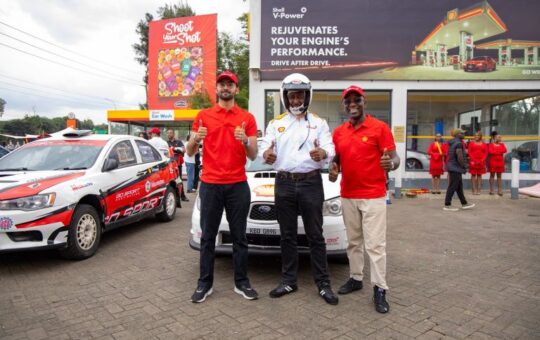 From left; Shell sponsored driver Rajveer Thethy poses for a picture with Vivo Energy Kenya Retail Manager Patrick Masinde and...