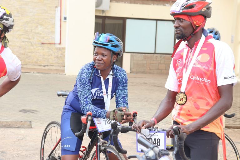 Kenya deaf cycling ace Brenda Bwire (Left) shares light moments with a fellow cyclist after she emerged champion of the fifth edition of Jubilee Live Free Race held in Nairobi on Sunday October 5, 2025. PHOTO/ KSFD