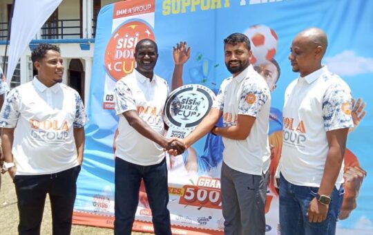 Tournament officials reveal the championship trophy during the kick off of the 2025 Sisi Ni Dola Cup at the Mombasa...